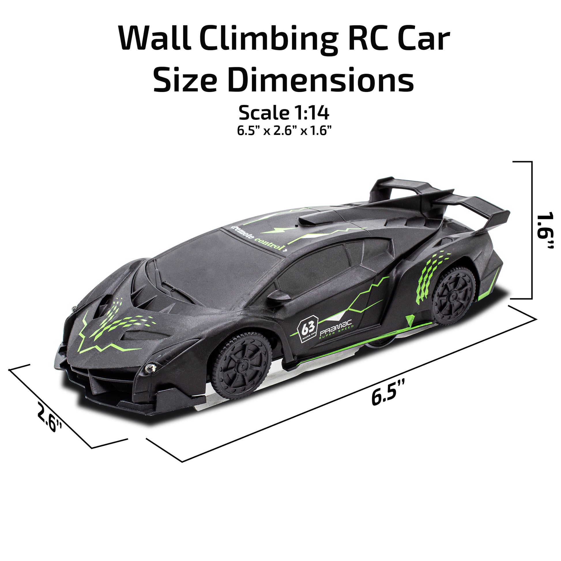 Our Stunt RC Car can rotate 360°. Car Dimensions: 6.5” x 2.6” x 1.6”. Scale 1:14.