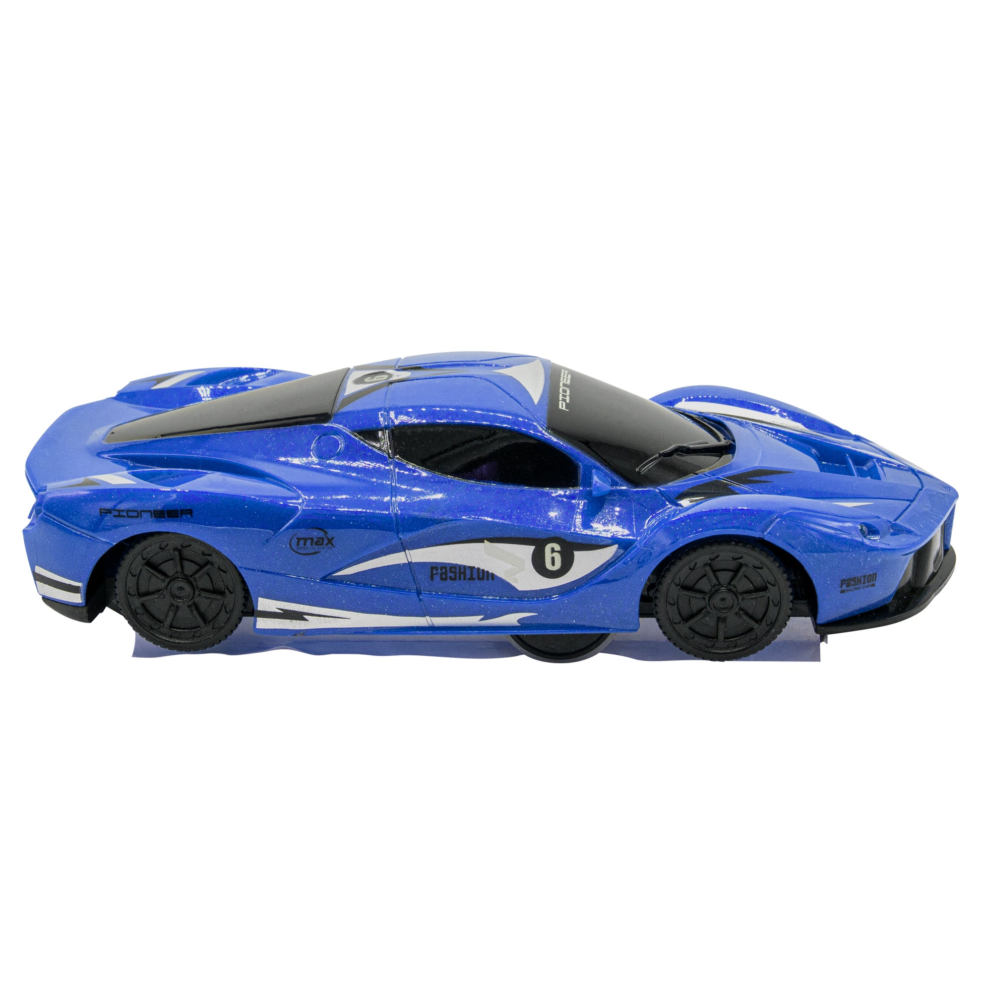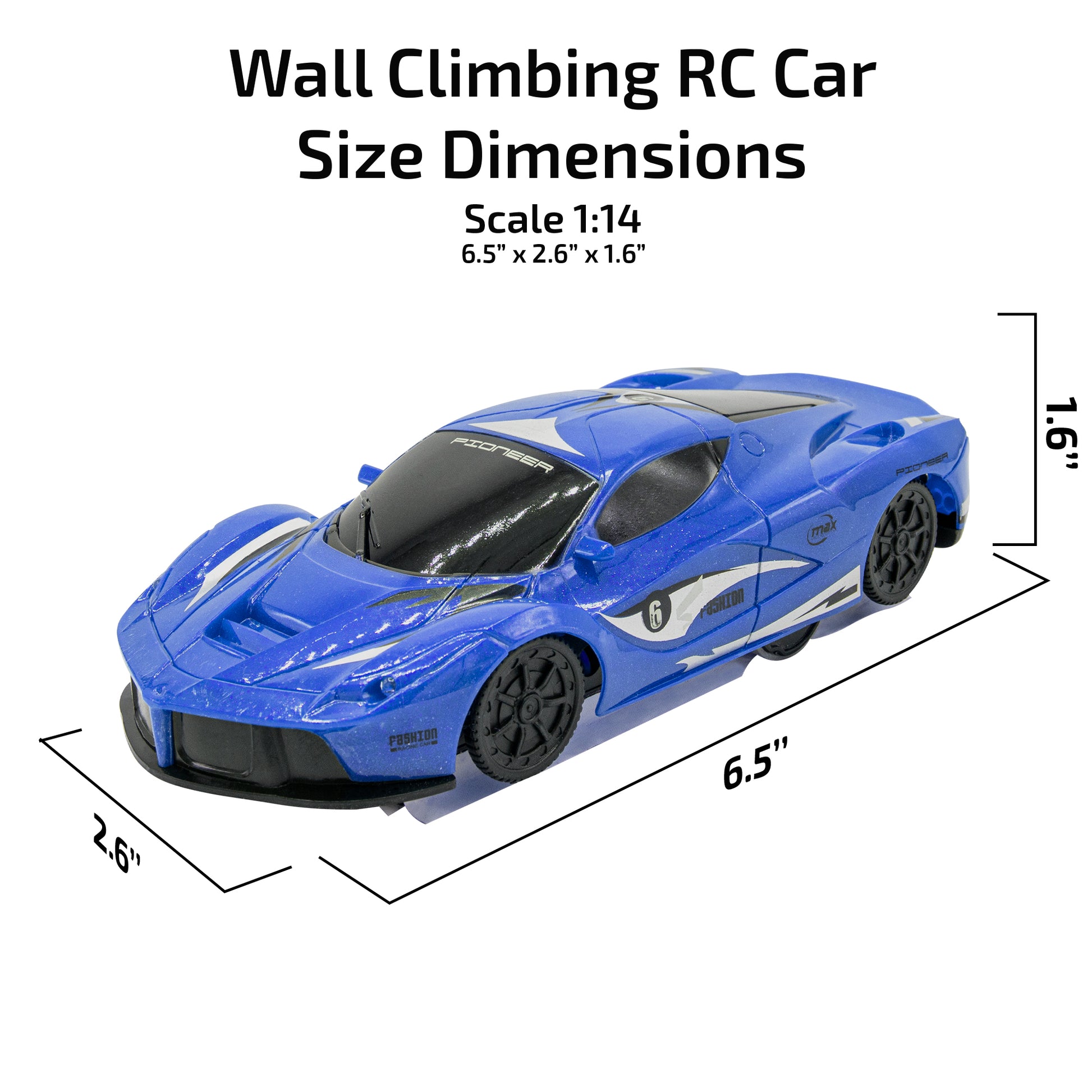 Our Stunt RC Car can rotate 360°. Car Dimensions: 6.5” x 2.6” x 1.6”. Scale 1:14.