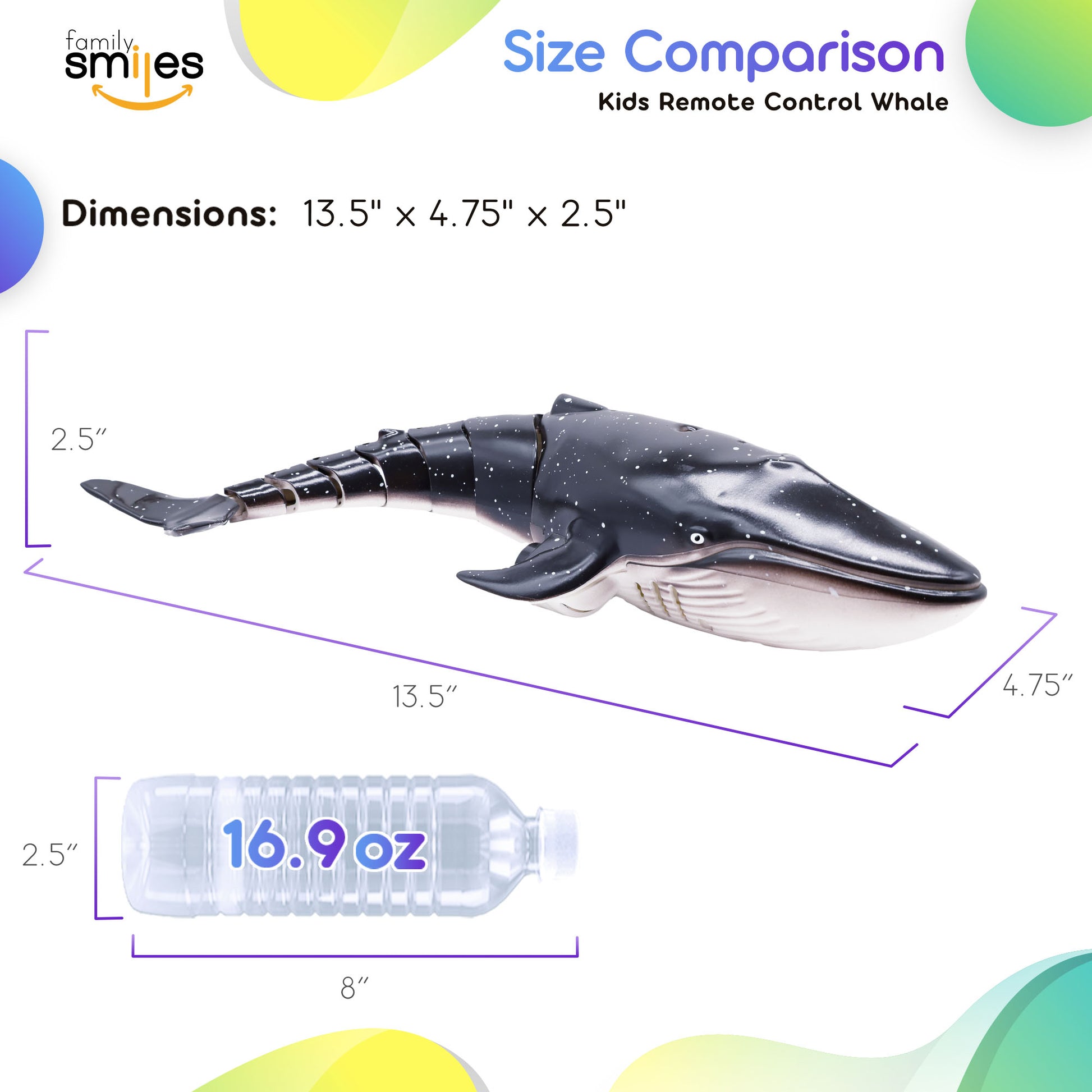 - Whale Toy Size 13.5" x 4.75" x 2.5" | RC Requires 2AA Batteries (Not Included)