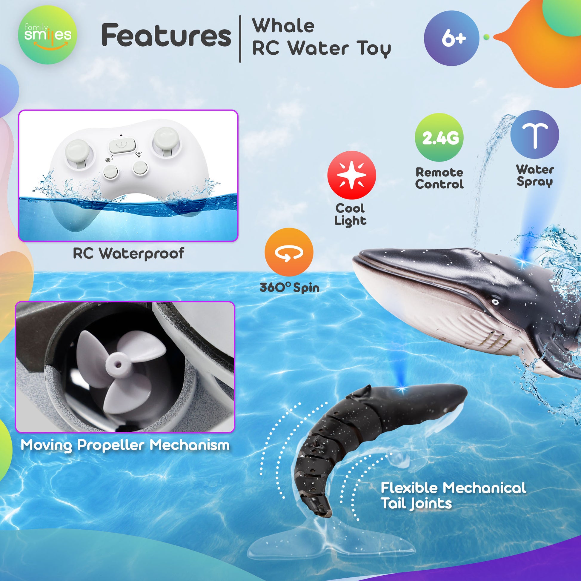 Dive into endless fun with the Family Smiles Kids Remote Control Whale Pool Water Toy, perfect for boys and girls who love water adventures. This remote control water toy delivers lifelike swimming action, bringing excitement to pools, bathtubs, and beyond. Whether you’re looking for cool swimming pool toys or unique kids’ water toys, this RC whale toy will captivate children with its thrilling features.