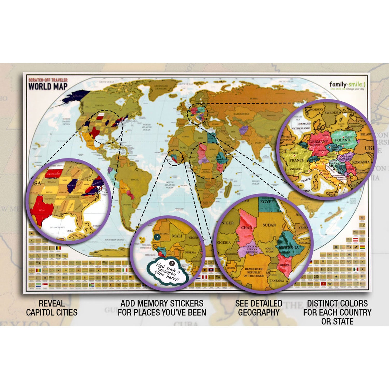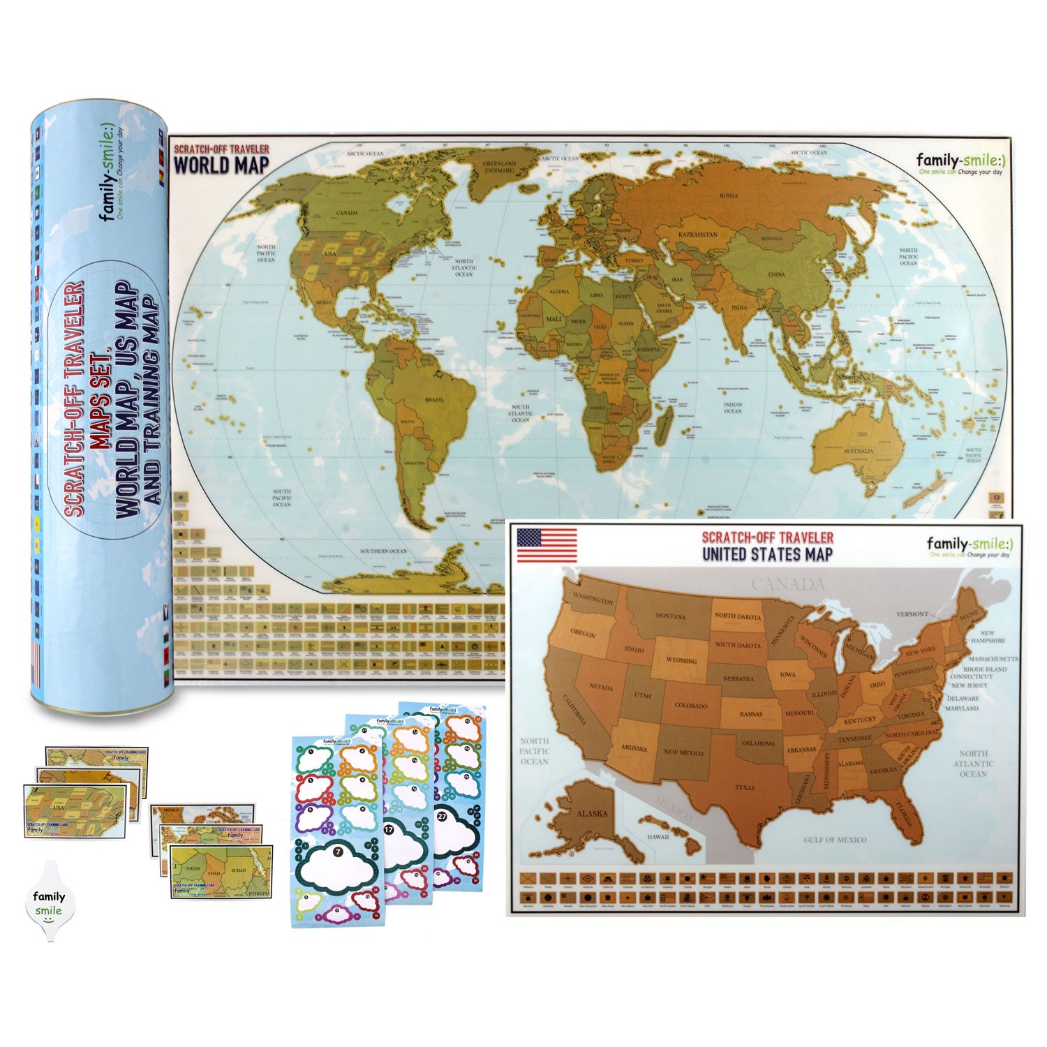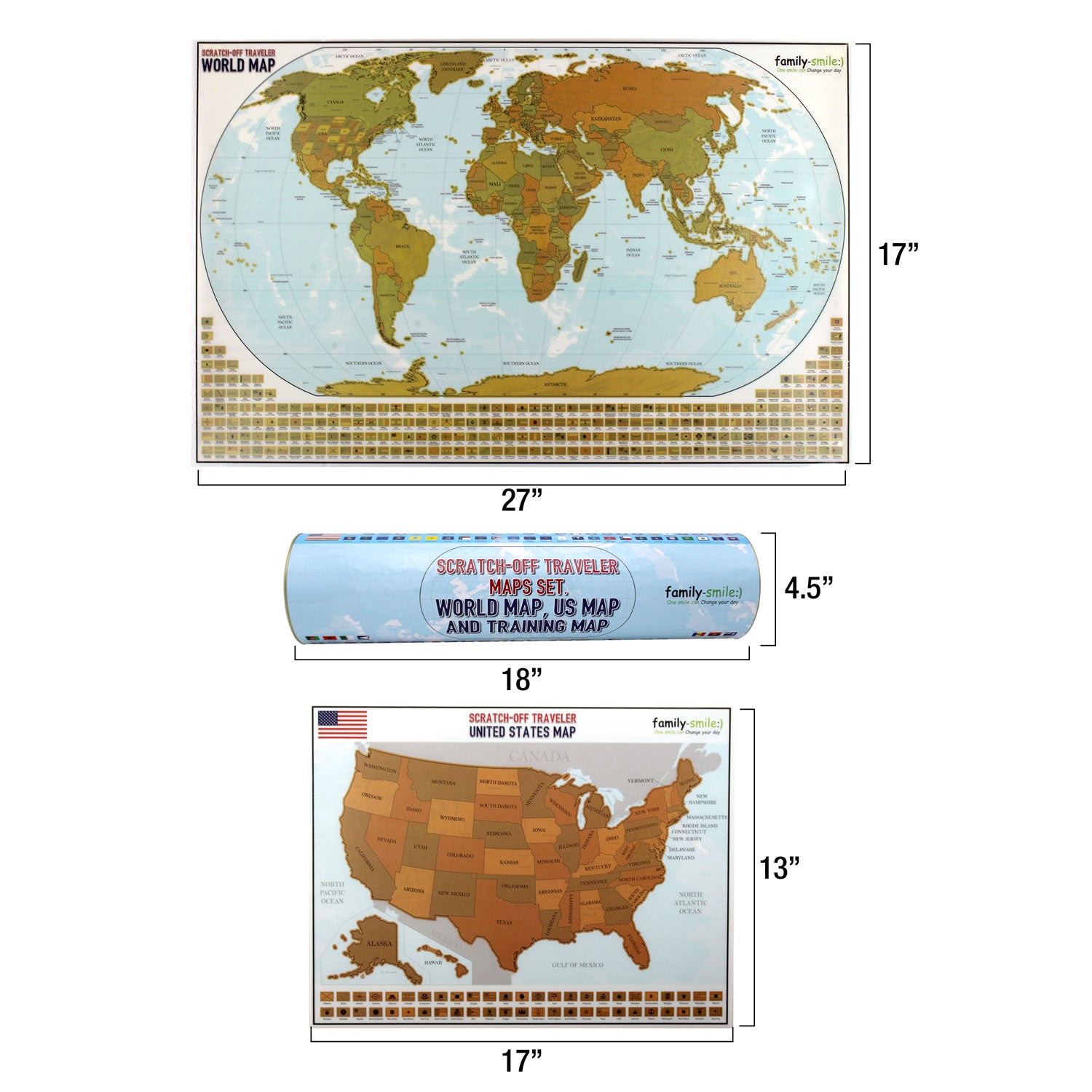 Family Smiles Map Scratch Off World 12 x 27 and USA 13 x 17 Maps 2 in 1 Kit Educational Log Travel Wall Poster Learning Set Scratchable Flags Geographic Toys for Kids and Adults